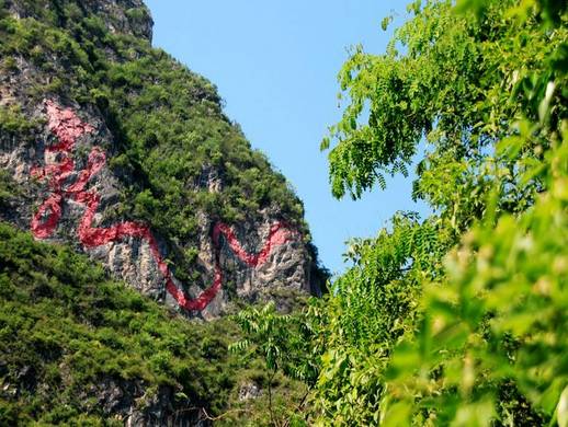摩崖石刻“龙”字地跨东经110°11′——北纬32°48′;经多名能工巧匠精雕细琢,历时九个月,于2010年10月雕刻完工,长123米,宽38.9米,在汉字“龙”字石刻中,独领国内,响誉海内外。