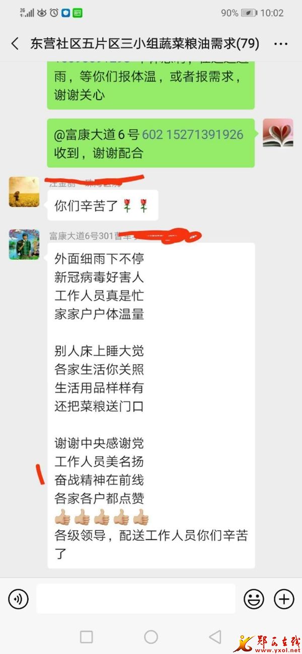 这是2月20日,东营社区住户曹先生发在第五网格需求微信群里发的一段文字。“当我看到网格员李赋明、张丽用手推车挨家挨户配送物资,在低温雨天里蜷缩在居民楼梯道内,提醒微信群内居民按时上报体温,坐在木头上逐个登记体温和生活需求,”感动之余的他,在微信群内写了这样一首感谢诗。