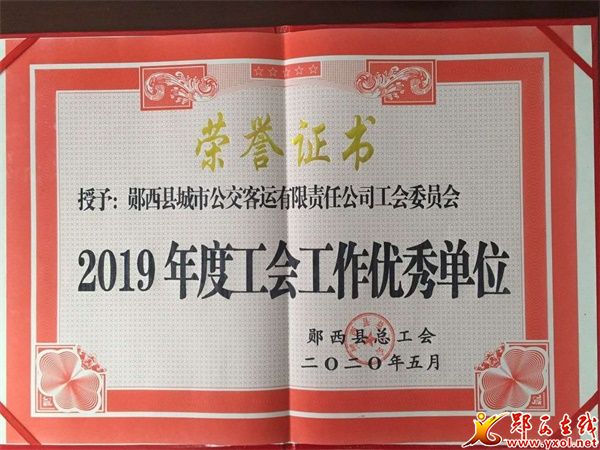 2019年,亨运郧西公交公司工会在郧西县总工会、亨运集团工会的正确领导下充分发挥桥梁和纽带作用,以构建和谐关系,打造党政满意、员工满意的双满意工会为目标,以服务企业大局,关心员工为主线,开展各项技能比赛,促进员工素质提升;关心帮扶困难员工,保障职工合法权益;创新各类文体活动,活跃员工健康生活;完善职工之家建设,提升工会工作水平;开展了一系列凝心聚力的工会活动,提高了广大职工的归属感、认同感、幸福感;得到了上级工会组织和职工的一致好评。被郧西县总工会授予“2019年度工会工作优秀单位”荣誉称号。