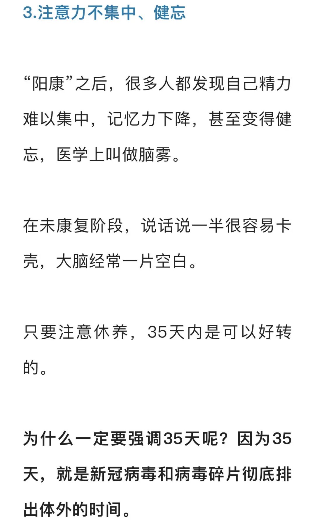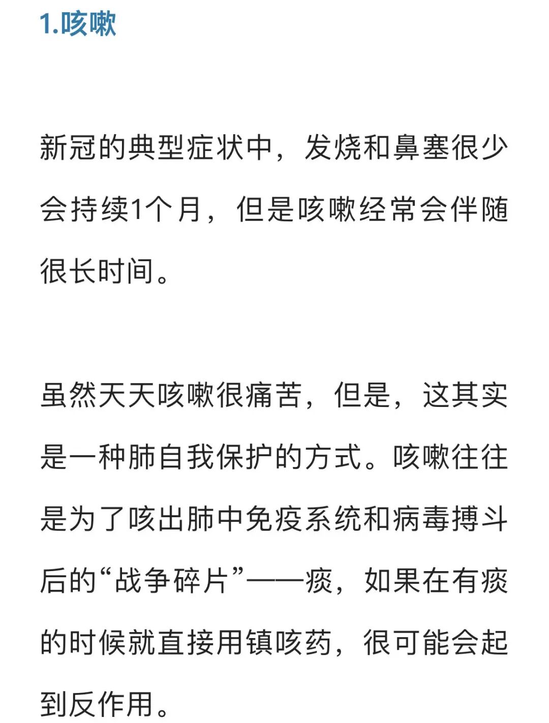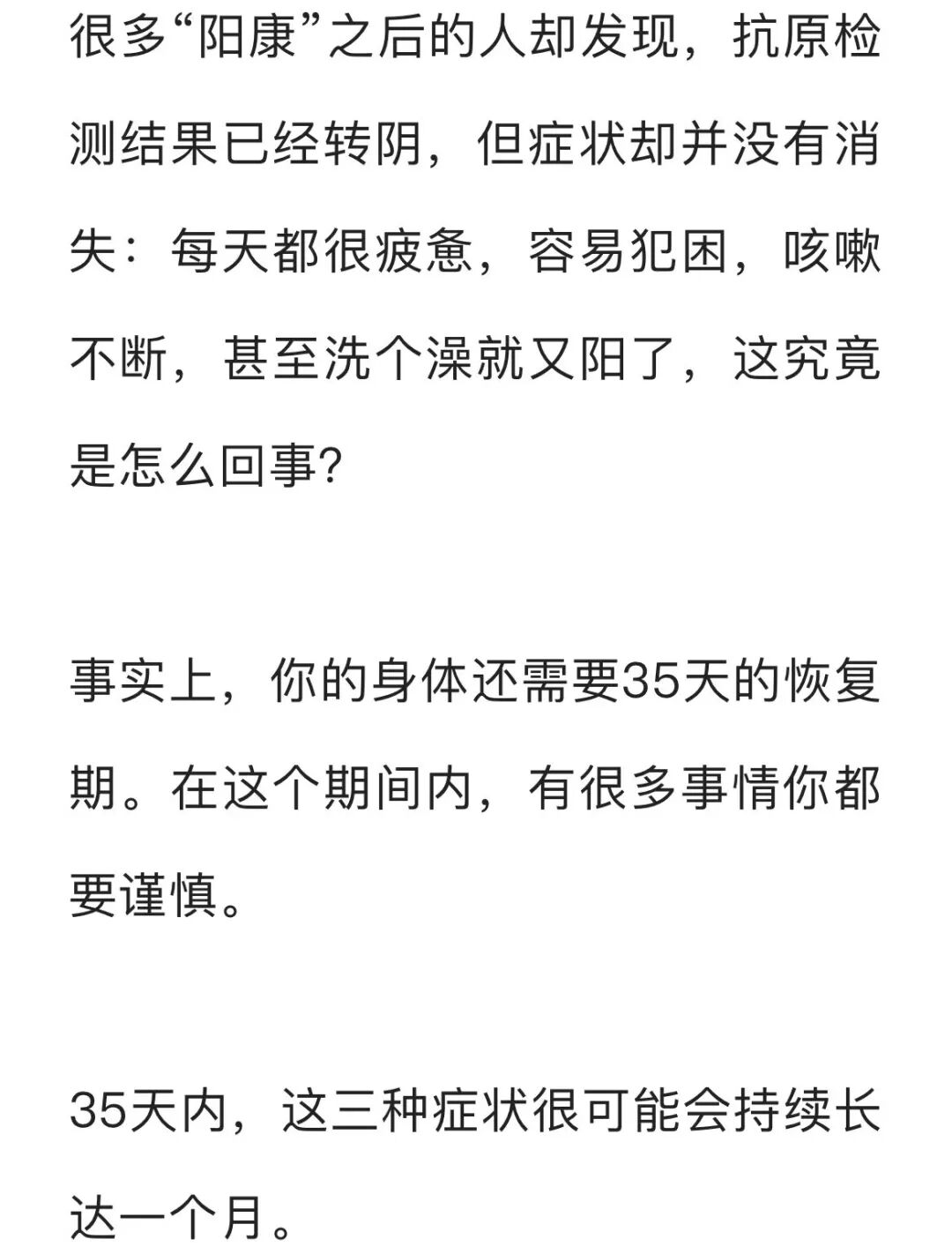每一个“阳康”的人都要注意休养,不能吹风,受凉,不吃冷的饮品和食品,不能运动、打球、跳操跑步等,要静养,不能劳累,要强吃,强喝,多睡,强休息,乐观,排痰,尽量少洗澡,或不洗澡,一个月内,禁止饮酒。