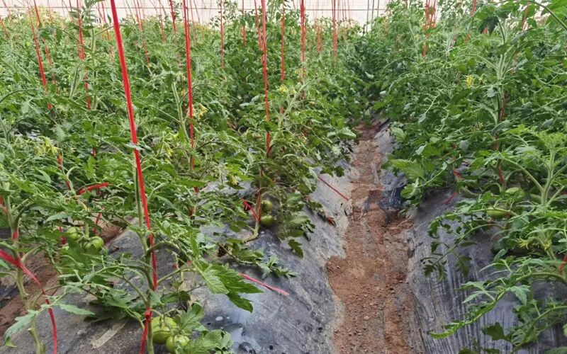 温室蔬菜大棚内,茄子、西红柿、黄瓜等蔬菜长势旺盛,一派春意盎然的景象。