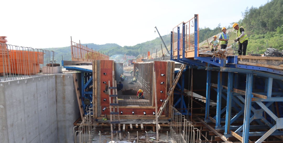 郧西高铁站设计为两台四线,中间正线采用3-32m双线现浇预应力混凝土简支箱梁,两侧到发线采用3-32m单线现浇预应力混凝土简支箱梁。笔者在施工现场看到,坚固的桥墩和密密麻麻的支架稳稳托起宽阔又厚实的箱梁,工人们正紧锣密鼓地加固到发线支护体系和挷扎钢筋,有望6月底车站两台四线路基接通成形。