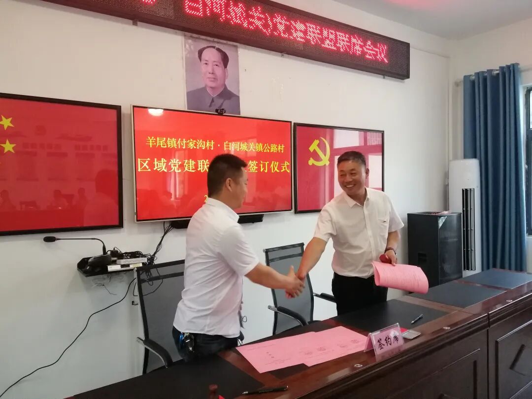 为进一步深化鄂陕区域党建联盟联建工作,羊尾镇高庄村与白河县城关镇群力村、付家沟村与公路村、莲花池村与河街社区、老观庙村与狮子山社区,结对签订了联建村区域党建联盟工作协议。