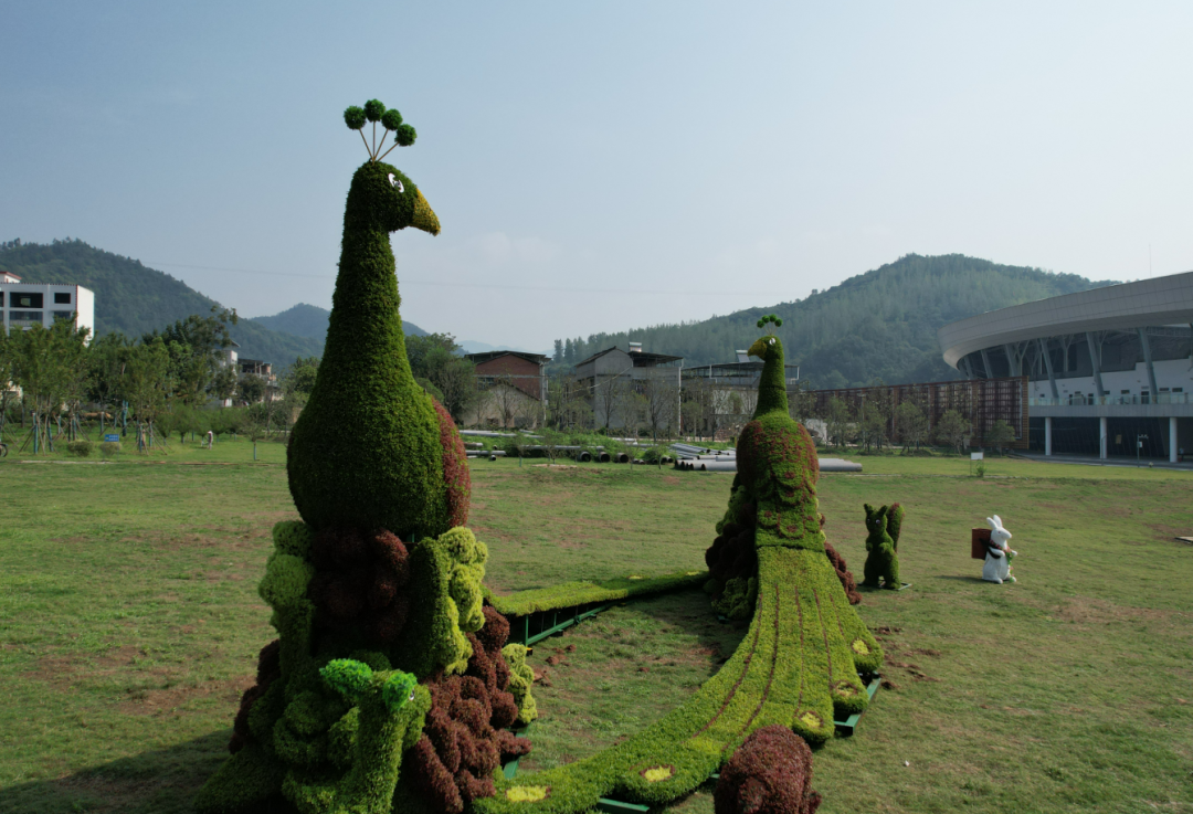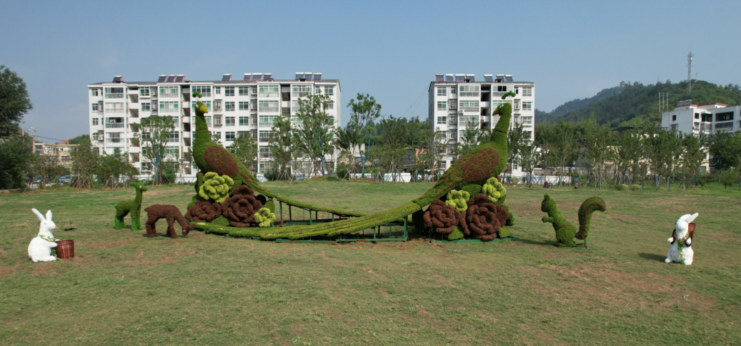 在文体中心的草坪上,孔雀、松鼠、鹿等动物为主的扎景,造型各异,吸引着市民上前观赏、拍照留影。