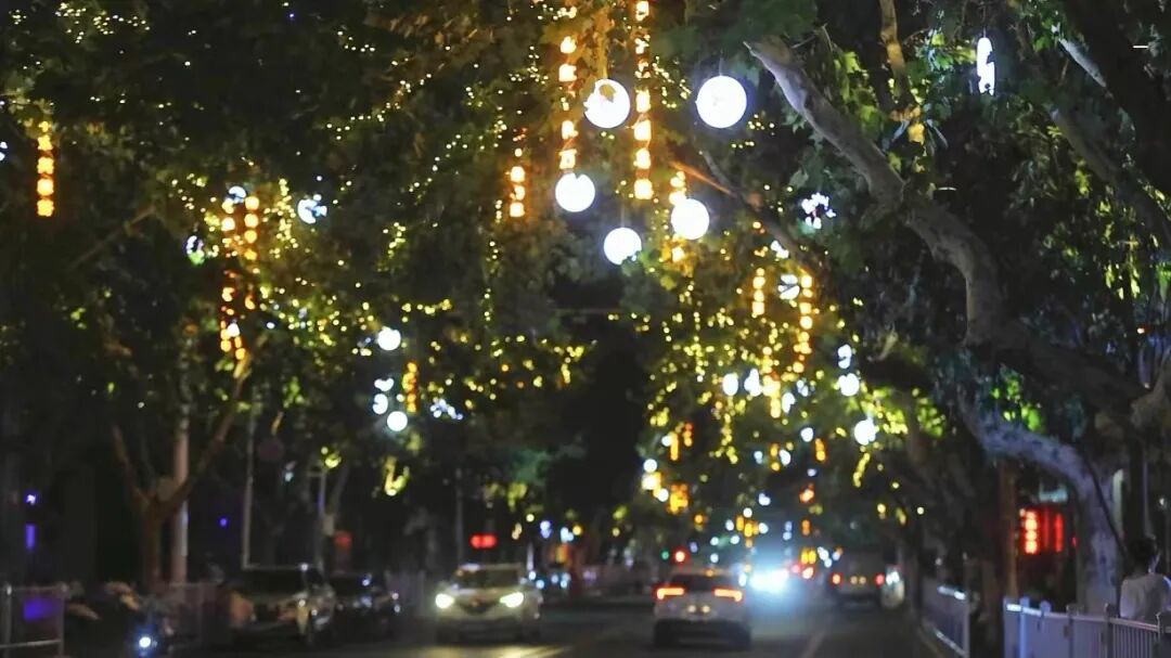郧西大道和人民路街道两旁的树枝上金色的星状灯带缠绕树干一条条诗词灯饰悬挂空中