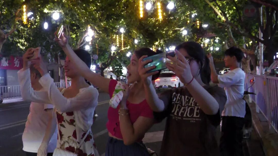 街道上匆匆行走的市民放慢脚步、驻足停留用手机定格美丽瞬间也用心感受这曼妙灯光下的诗情画意