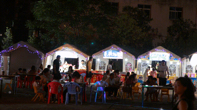 夏日的夜晚玩累的游客们坐下来点上一些美食小吃吃饱之后