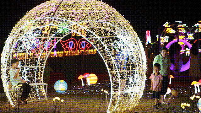 游客们在七夕夜赏灯追光