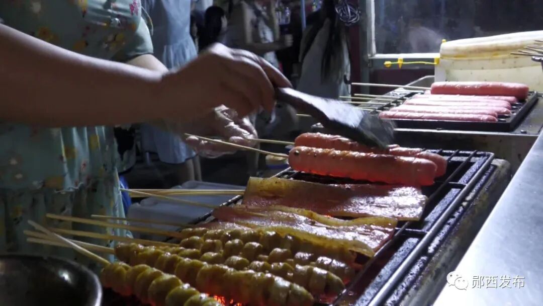 夜幕降临,华灯初上在县文化体育中心外广场灯光璀璨,人头攒动烤串、臭豆腐、酸辣粉、凉皮米酒小汤圆……眼花缭乱的小吃让人味蕾大开。