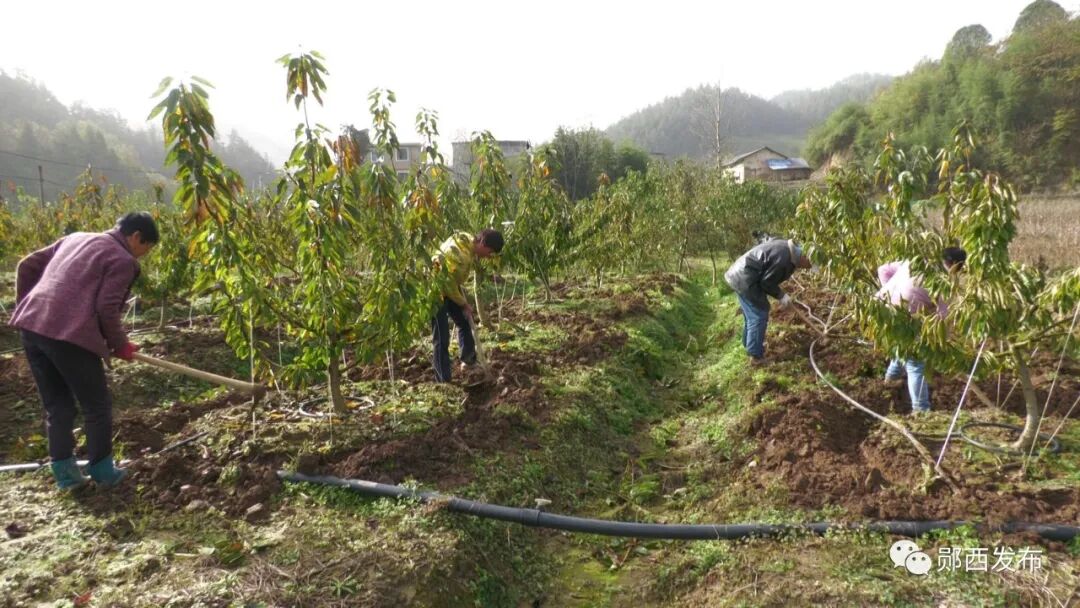 11月18日,在观音镇县沟村榆树垭桃树种植专业合作社的果园里,10余名工人正在熟练地对桃树进行挖沟、施肥现场一派繁忙景象.