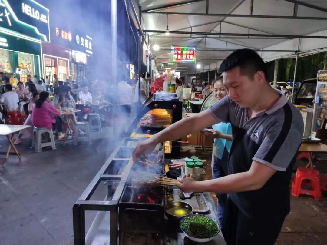 烤羊肉串、肉夹馍、烤鸡腿、葱油饼、麻辣烫……在整齐划一、一字排开的摊位中,各种美食小吃应有尽有,食客们漫步到心仪的摊位前与摊主欢谈、让味蕾绽放,每一个笑容的背后都表达着满足。