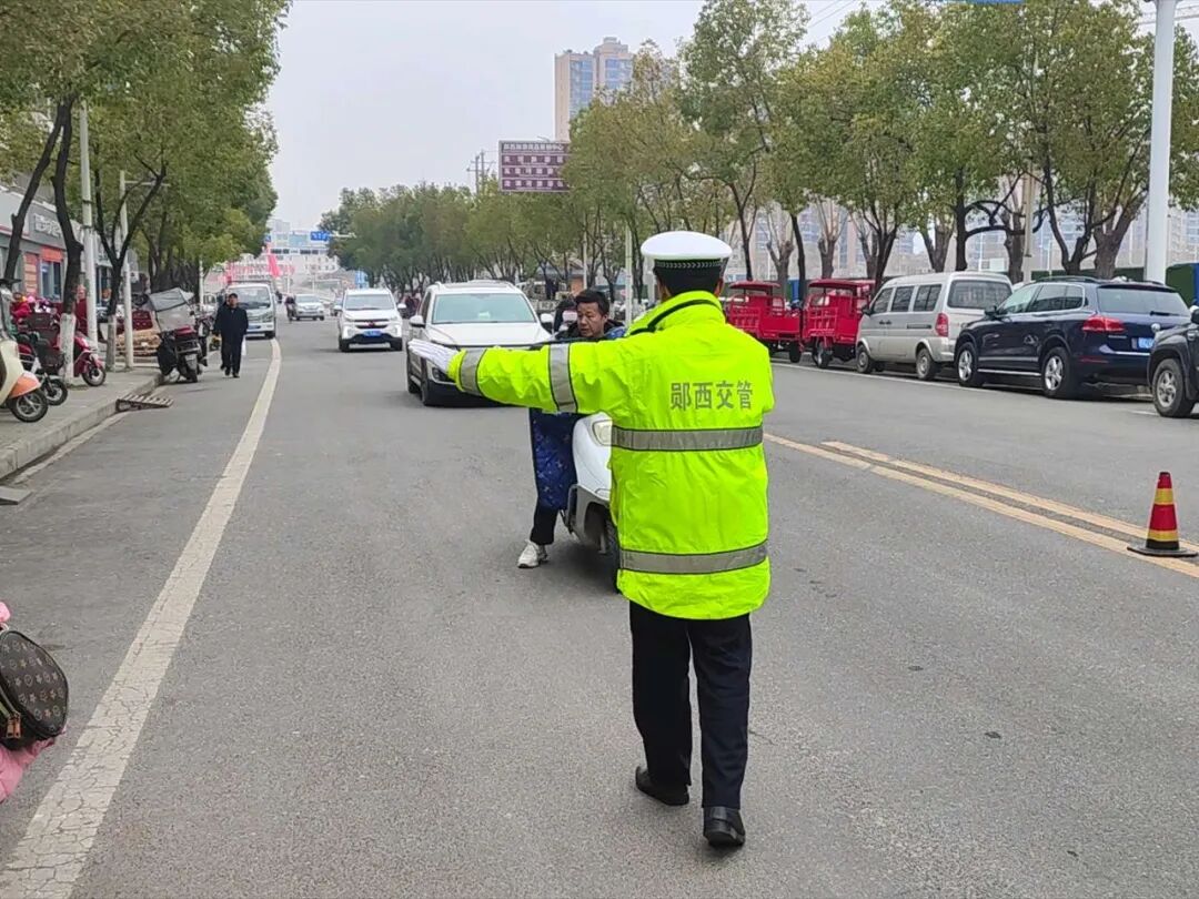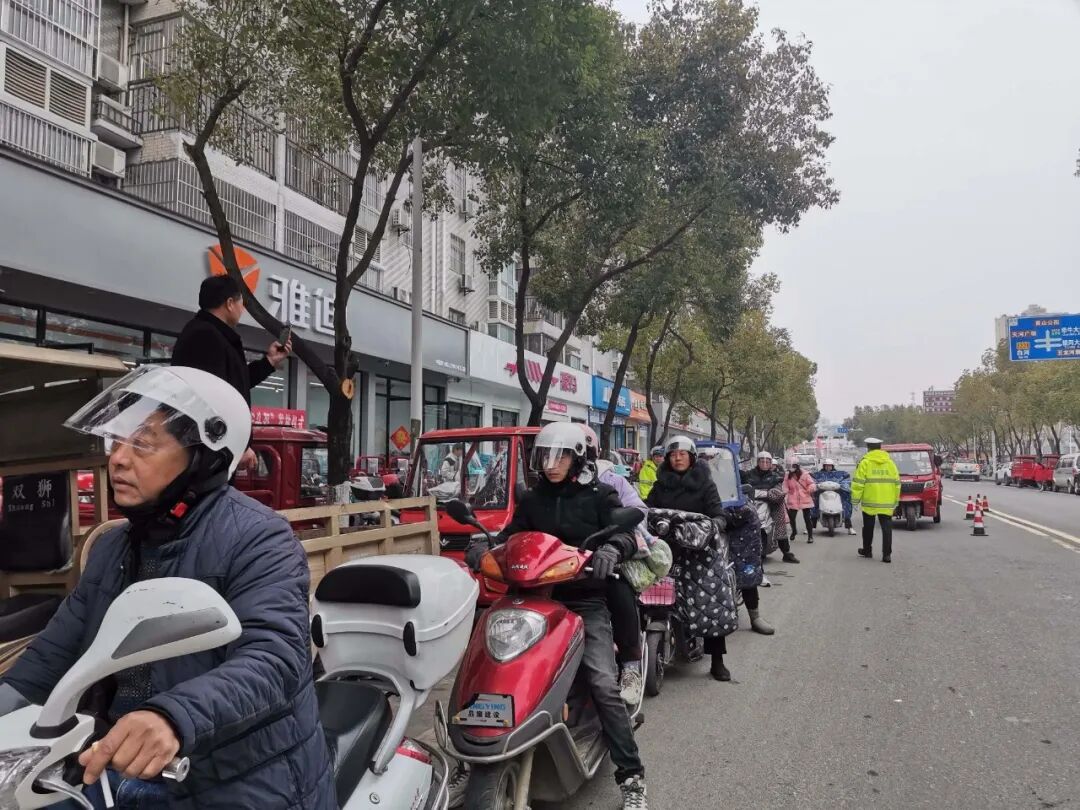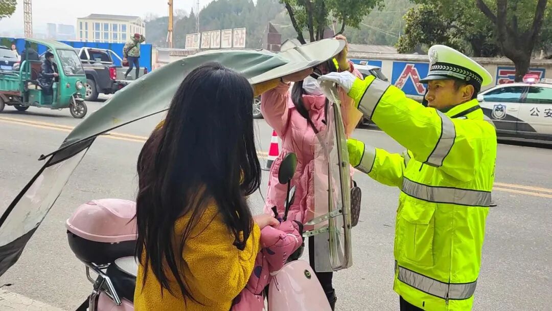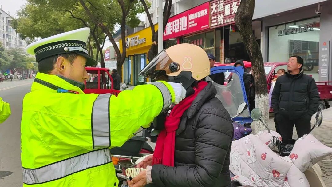 在佘家湾大道,民辅警有序分工,在维护交通秩序的同时,对骑乘摩托车、电动车未戴安全头盔以及加装遮雨棚等行为的群众,及时拦停并进行劝导和教育。