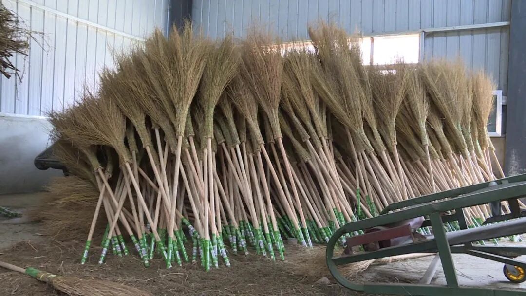 日前,记者在公司看到,车间内工人们正忙着捆扎扫帚,把成品扫帚进行分拣各个生产环节分工有序一派繁忙景象。