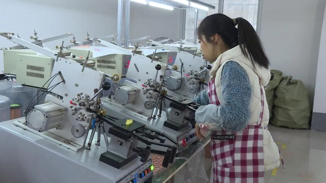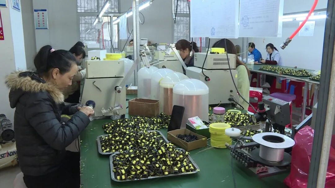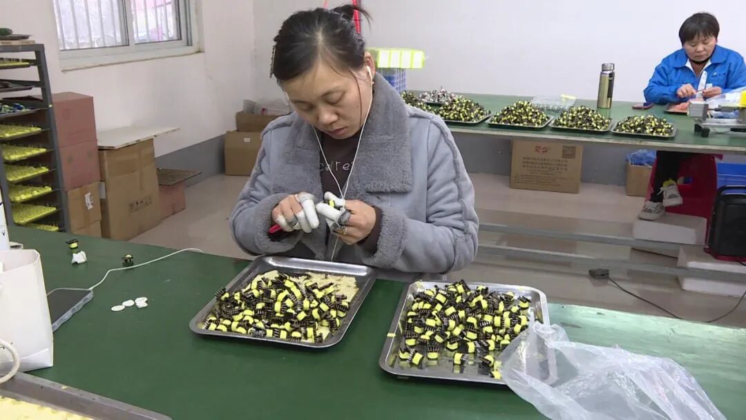 日前,记者在羊尾镇福民科技有限公司看到,车间的生产线上,机器运转不停,工人手法娴熟,为了早日完成一季度新能源磁性元器件的订单任务,三十多个工人正在抓紧时间生产。