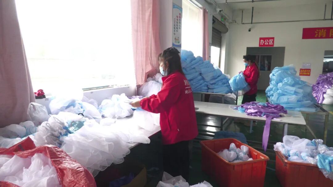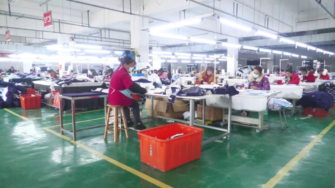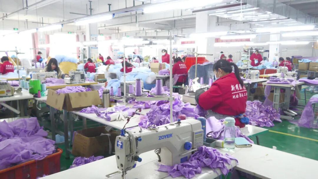 走进湖北新耀实业有限公司制衣车间,机器的运作声不绝于耳,工人们分工协作,裁剪、缝制、熨烫、打包......一派繁忙的景象。