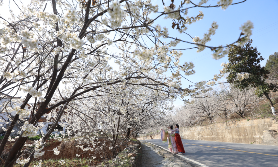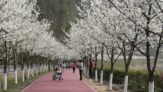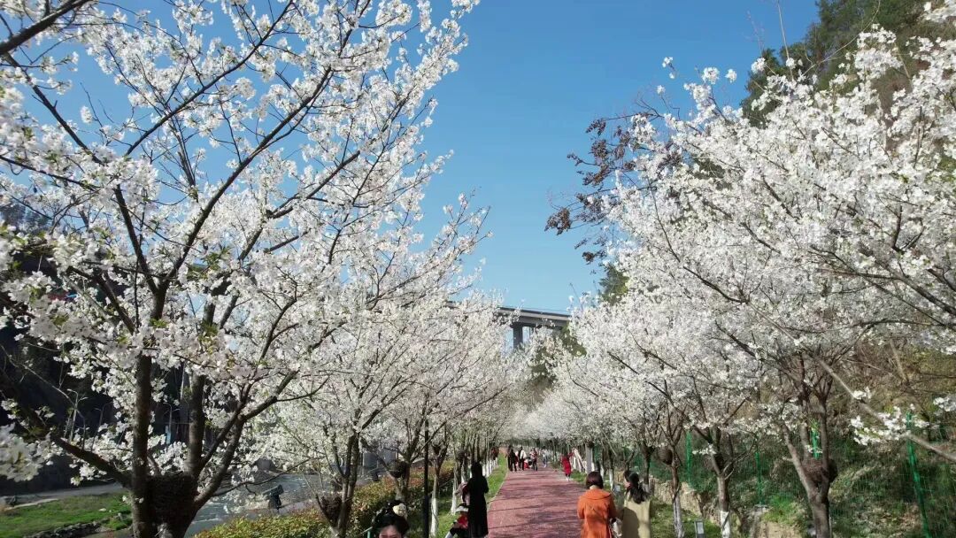 眼下,作为郧西县热门赏樱地之一,天河水乡沿线的樱花竞相绽放,一朵朵娇俏的樱花缀满枝头,将天河水乡装扮成花的画廊。游客穿梭其间,或赏花,或拍照,勾勒出一幅情趣盎然的“春游图”。