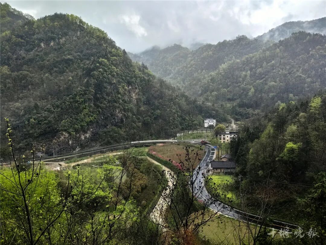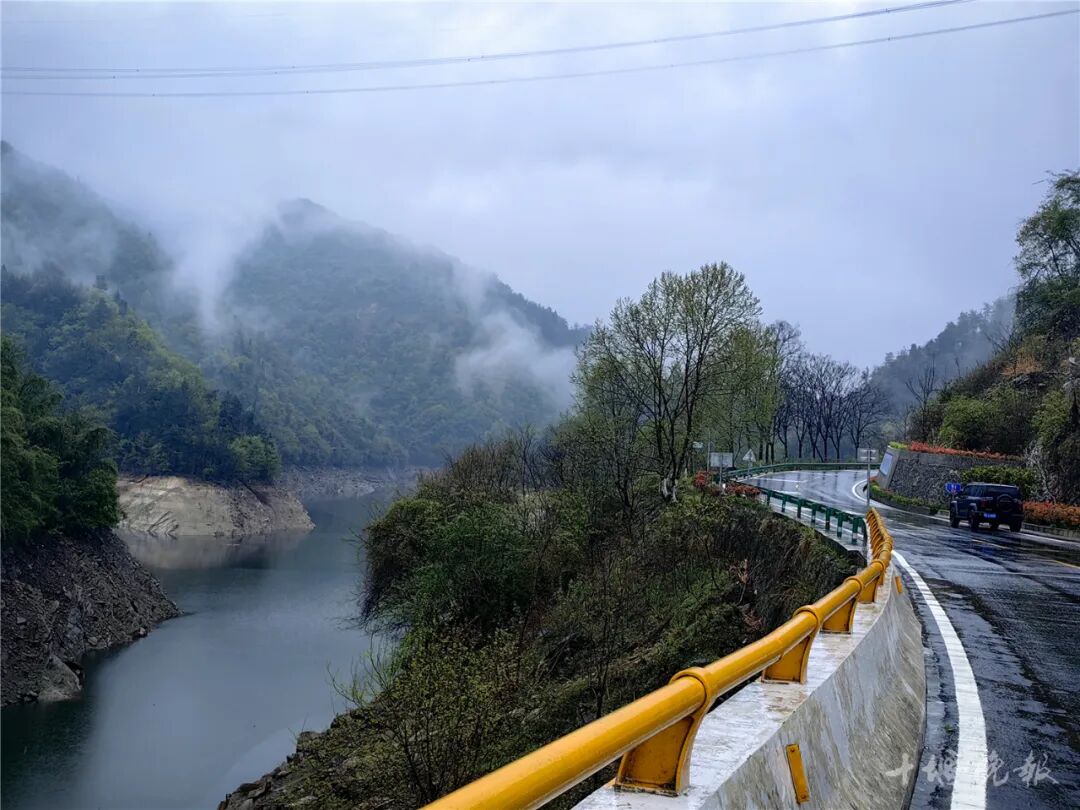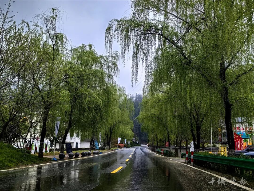 从海拔247米处的王家游园广场处开始,选手将沿五茅路、茅塔路继续向前。4月的春风,早已吹绿了沿途的山水,蜿蜒的赛道两侧,垂柳高悬、花香弥漫。茅箭区茅塔乡康家村村委会附近,柳条在风中摇曳,粉樱在缭绕的雨雾中绽放。两山之间,河道旁的片片油菜花田,尚蔓延着满眼金黄。