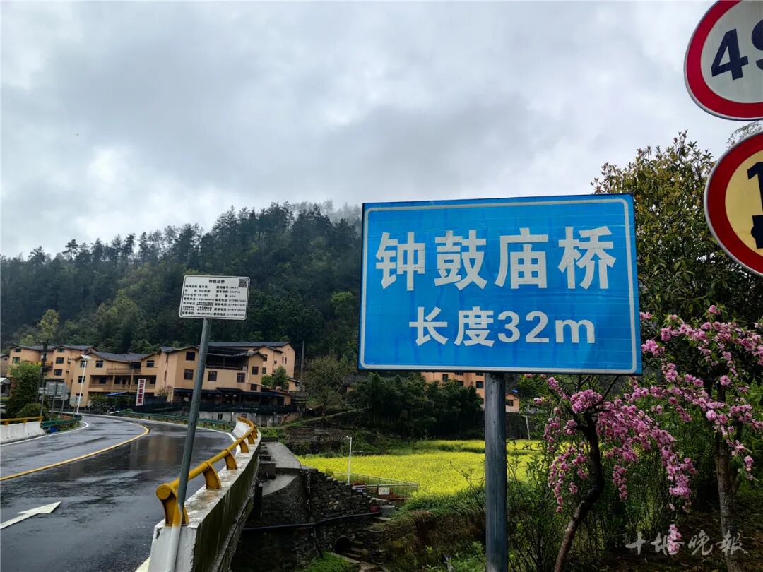道路时而平坦,时而沿着盘旋的山间公路向上。跑过钟鼓庙桥右拐,不远处的路边桃花还在绽放,赛道30公里的标识牌悬挂在一颗老柳树的树干上。一旁的小河水量丰沛,河道里几只白鹭在悠闲地觅食。此后约4公里的路程,道路平坦。