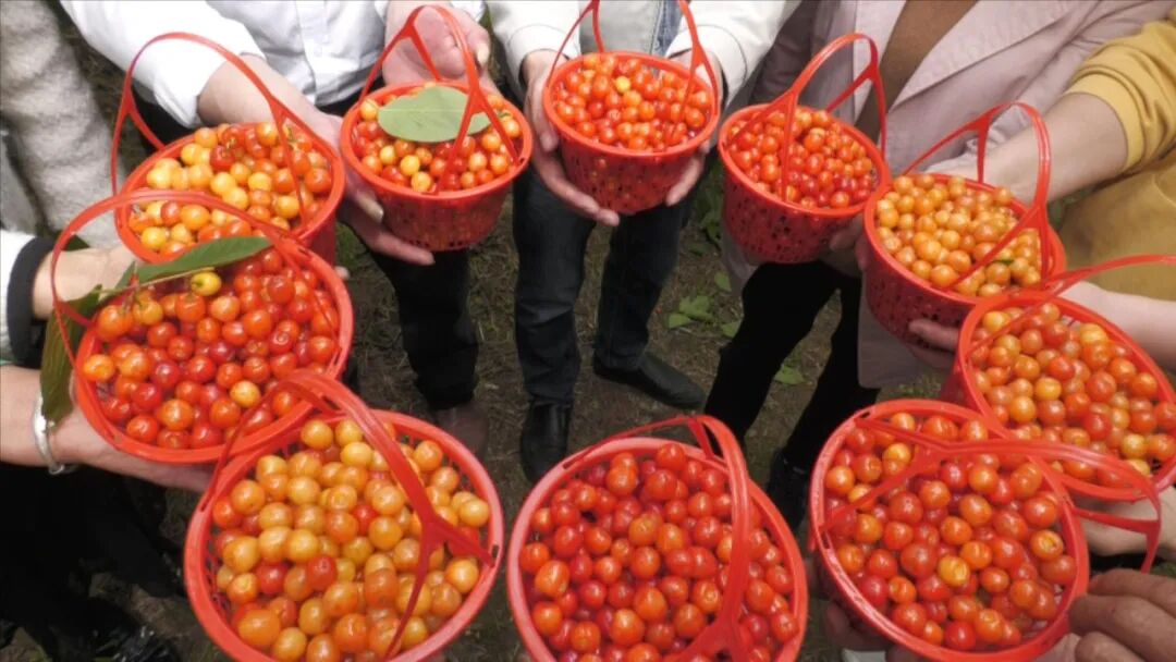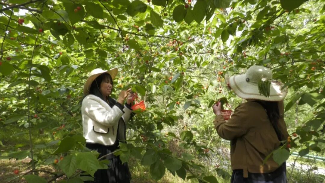 游客们穿梭在樱桃园里