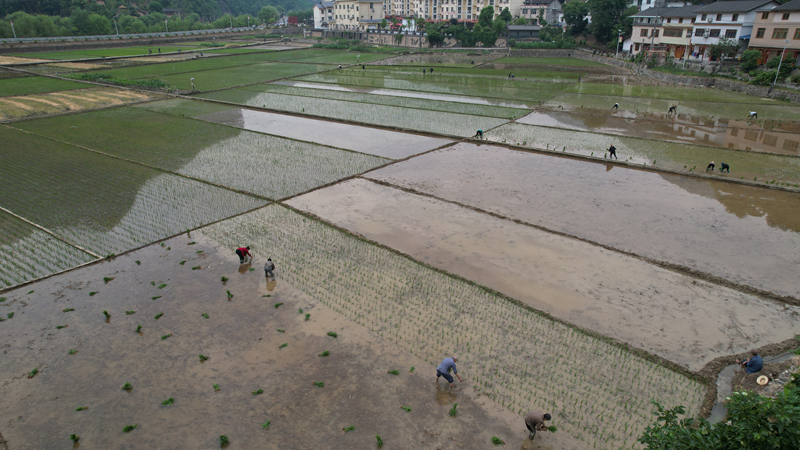 走进关防乡沙沟村,只见纵横交错的稻田水光潋滟,波光荡漾,村民们挽起袖子、卷起裤腿,熟练地放水、平整水田、施底肥、运秧苗、插秧,动作娴熟,环环相扣,阡陌纵横的稻田、辛勤耕耘的农人、排列整齐的秧苗和微风旭日里宁静祥和的村庄交相辉映,犹如一幅乡村田园水墨画卷。