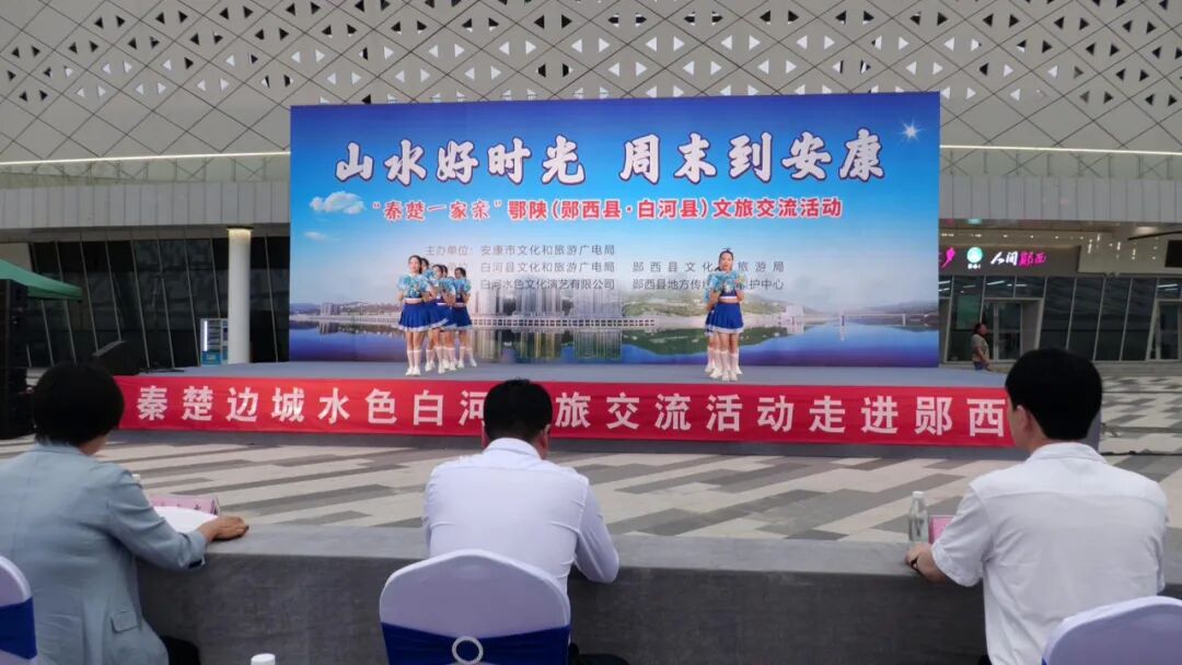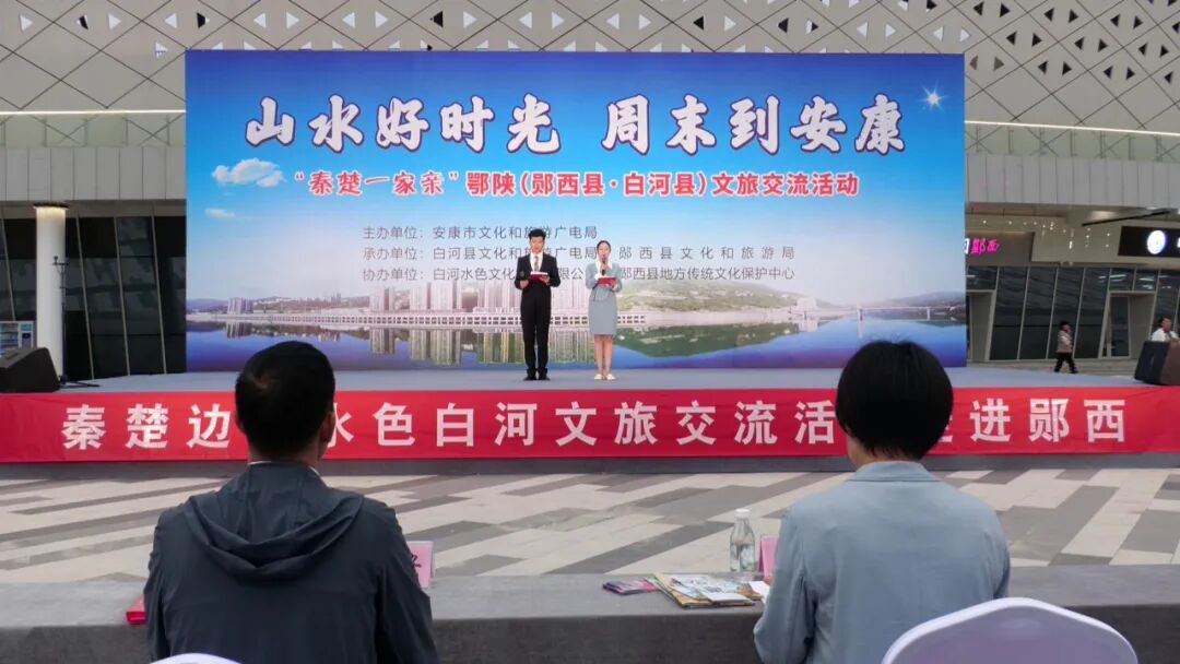 演出现场,安康市文化和旅游广电局、白河县文化和旅游广电局分别做了主题为“山水好时光 周末到安康”“秦楚一家亲”鄂陕(郧西县·白河县)文旅交流推介,并向现场群众免费发放了安康市龙舟节门票、白河县景区门票和文旅宣传资料。
