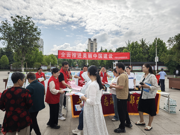 十堰市生态环境局郧西分局工作人员向公众宣传“全面推进美丽中国建设”环境日主题,通过设置主题展板、发放宣传册等多种形式,向群众展示我县生态环境自然风光和保护成果,宣传普及环保科普知识、绿色生活常识,传递低碳节能、绿色消费、生态循环、废物再生等环保新理念。