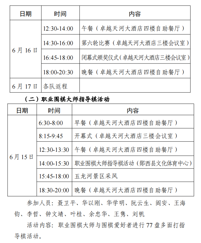 6月15日,开展职业围棋大师指导棋活动。届时,以围棋“棋圣”聂卫平为首的12位围棋大师与围棋爱好者进行 77 盘多面打指导棋,职业棋手与围棋爱好者的距离将被缩短在方寸的棋盘间。