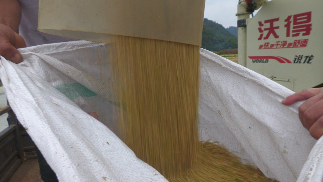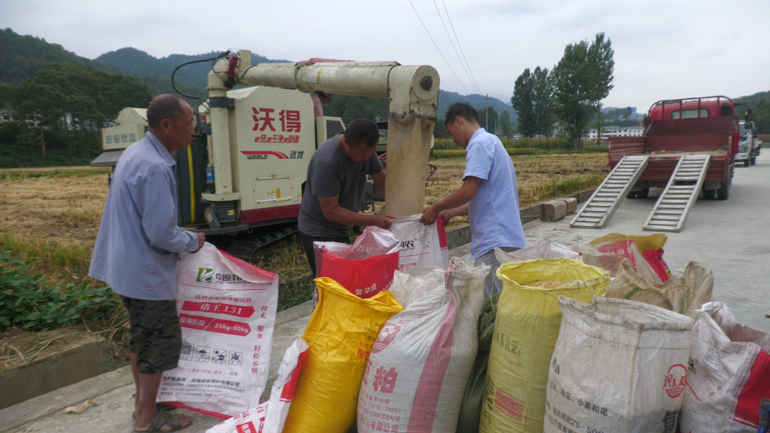 9月11日,在郧西县香口乡八亩地村三组付书祥的稻田里,联合收割机正在轰鸣,一行行稻谷被卷入割台,割稻、脱粒、粉碎秸秆一气呵成,颗粒饱满的稻谷随着收割机的管道倾泻而下进入“粮袋子”,付书祥忙着装袋、打包、运送稻谷,脸上洋溢着丰收的喜悦给我们算起经济账,“我有一亩七分地,如果请人工需要8个人,一人一天100块就得800块钱,机器收只需200多块钱,省时省工还减少损失。”