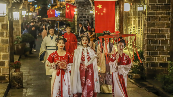 在城关镇老北街低碳文化街区,织女汉服、天河古榨、乞巧织布、做花馍,还有"晚留郧西·亲近汉服"中秋国庆汉服巡游活动,游客们尽情体验非遗项目的文化魅力,共享非遗文化的"中秋味"。