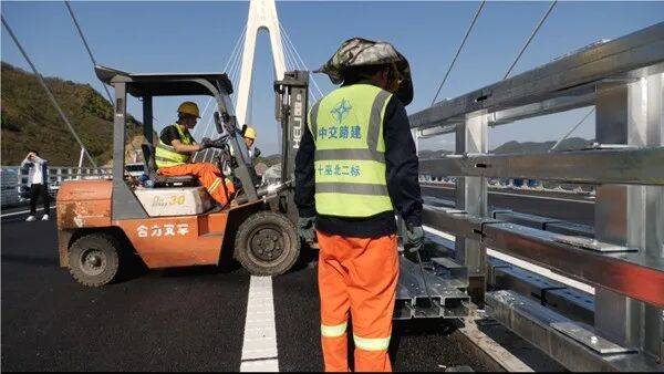在十巫北高速公路关键控制性工程——汉江特大桥建设现场,工人正在安装路肩带防撞护栏,沿途工程车、洒水车来回作业,收费站周边和沿途绿化工程也进入收尾阶段。