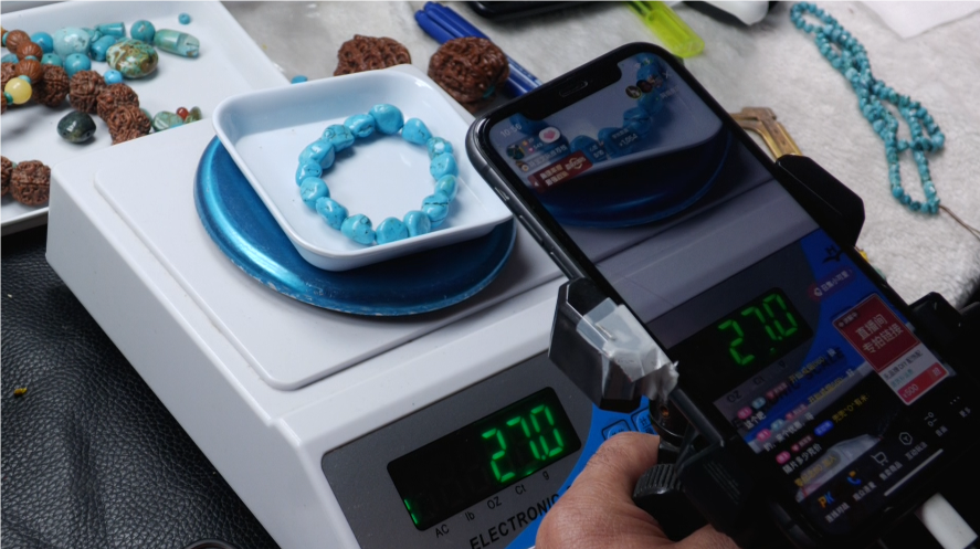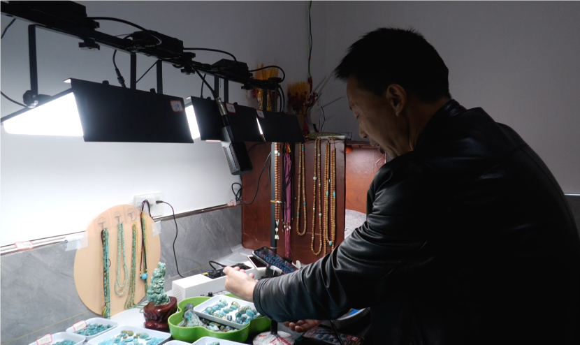 下营村2组“鑫哥文玩配饰”绿松石经营店店主张辉华一早就做好了直播准备,短短一个多小时就实现线上交易5000多元。据张辉华介绍,他从业余直播爱好者,到绿松石手串、项链、挂件等饰品的选材,直播话术训练、拍摄剪辑、批量订单发货的稳定运行仅用了一年时间。