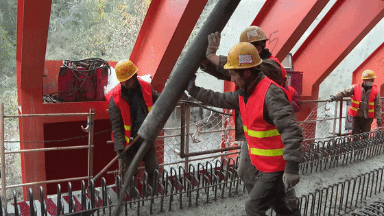 9日下午,记者在河夹镇西十高铁湖北段火车岭隧道口进口看到,一辆辆满载混凝土的运输车陆续到达现场,在机械臂的作用下,砂浆被灌注至移动模架的梁体当中。工人们一边进行振捣作业,一边为浇筑的梁体用上保暖装备。
