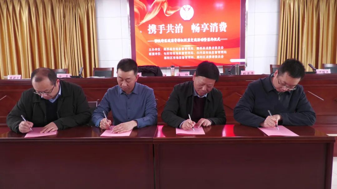 活动现场,郧西县市场监管局、郧阳区市场监管局、旬阳市市场监管局、白河县市场监管局共同签订了《鄂陕跨区域消费维权联盟工作合作协议》。