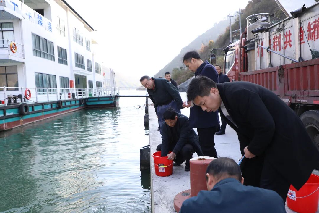 12月17日,郧西县2024年生态保护渔业增殖放流活动,在汉江郧西段孤山电站趸船码头举行共放流鲢鳙、草鱼鱼苗200万尾.