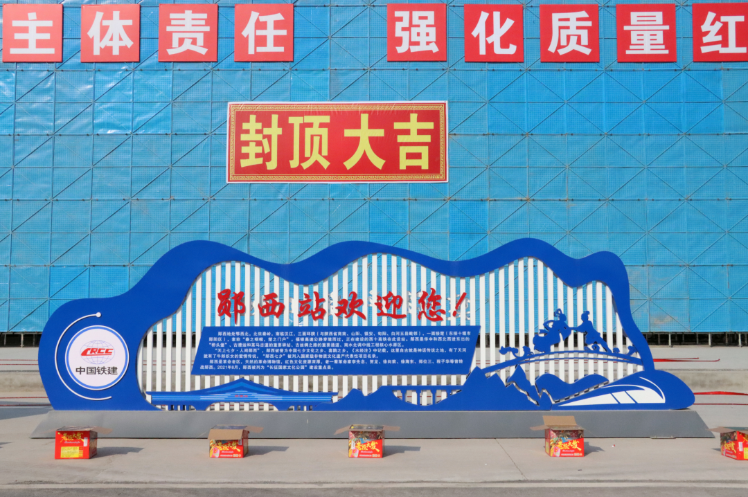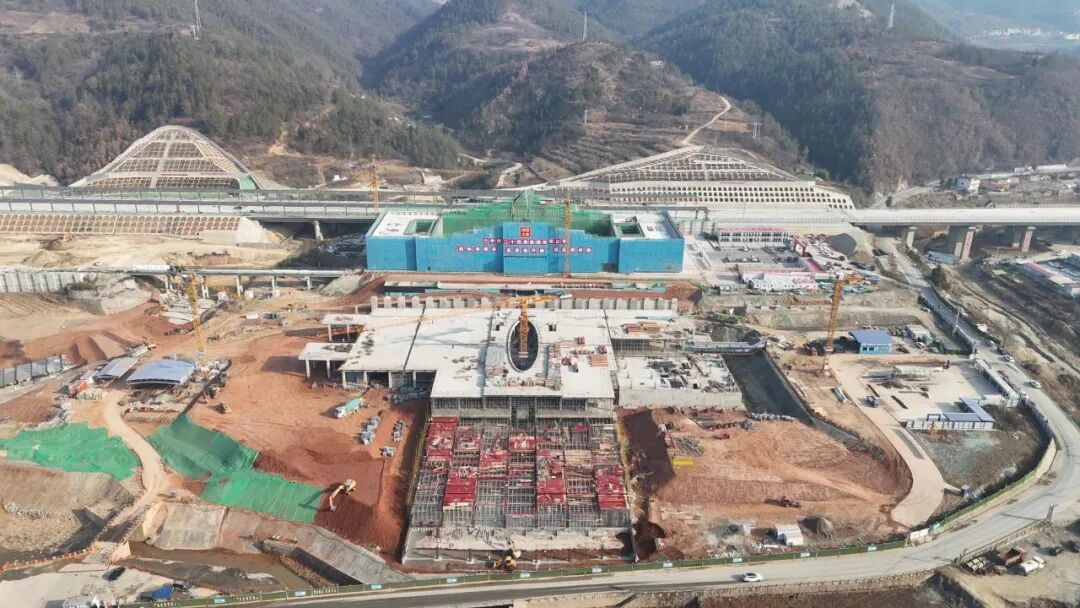 西十高铁郧西站位于县城以东的激浪河和黄石梁两村交界处,总占地面积174亩,车站总规模为2台4线,最高聚集旅客800人。站房形式为线侧下式站房,建筑面积9990平方,平面尺寸为139.2米x52米。站房主体一层,高度20.6米,结构形式为混凝土框架结构,屋面为钢网架结构,抗震设防烈度6度,局部两层。此次主体结构封顶,进一步刷新了西十高铁湖北段全线工程建设的进度,标志着郧西站站房将正式进入二次结构、钢结构、装饰装修工程施工阶段。