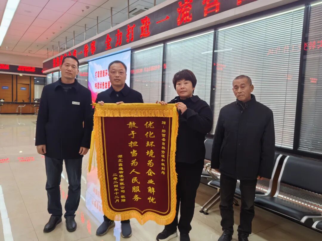 近日, 湖北鑫通物流有限公司总经理陈金波来到县行政服务大厅县自规局不动产登记中心窗口,将一面写着“优化环境为企业解忧 敢于担当为人民服务”的锦旗,赠送给县自规局,感谢他们为郧西光彩物流商贸中心排忧解难。