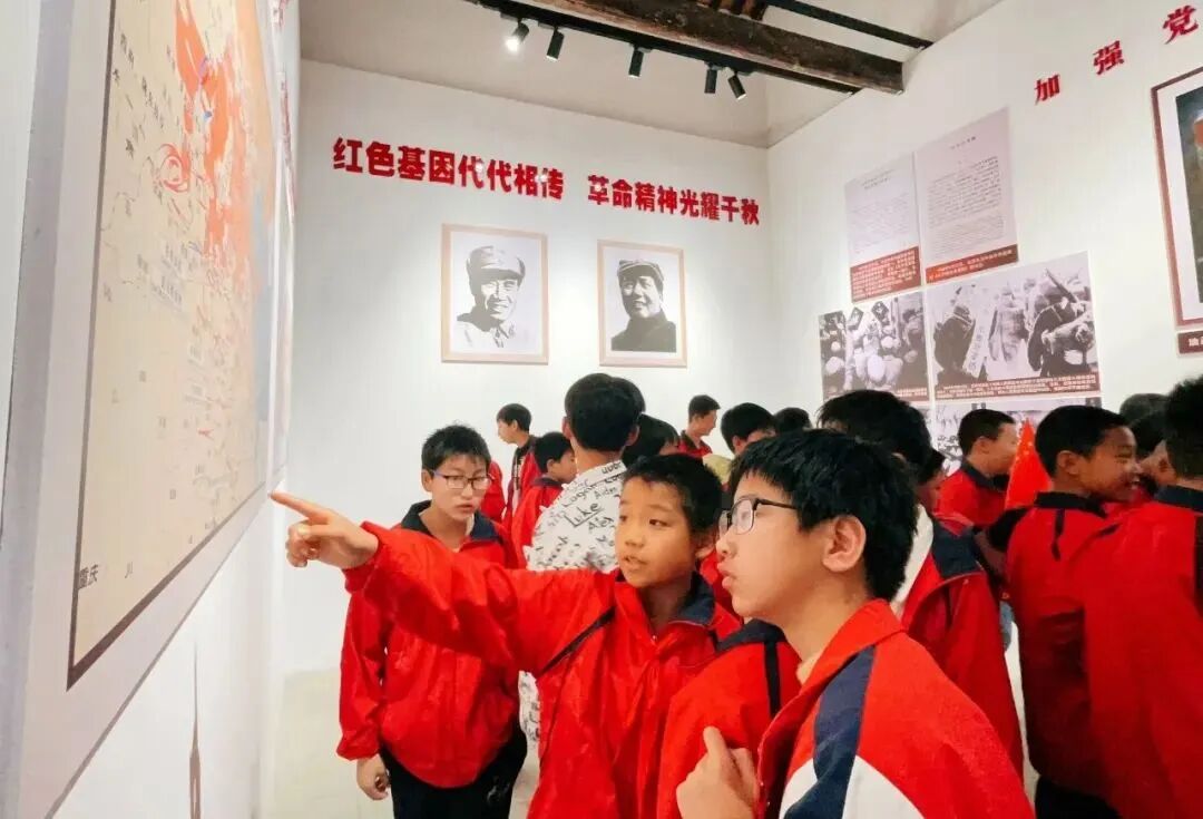 图为郧西县鄂豫陕革命根据地纪念园内,讲解员正在给师生讲述长征期间红二十五军转战郧西时的历史故事。