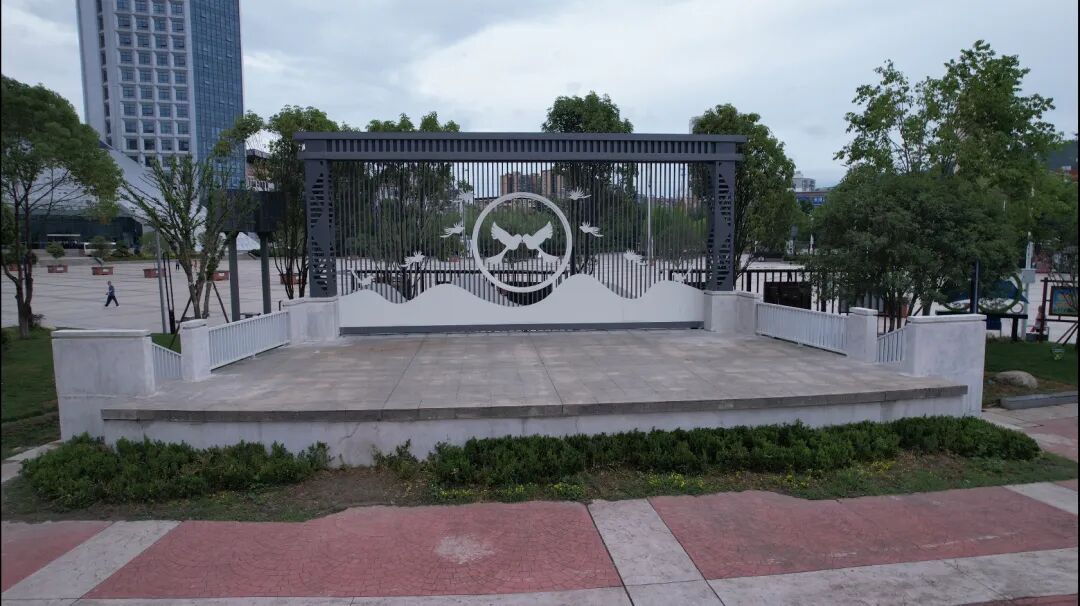 该项目位于郧西天河广场西侧,以“全龄友好”为核心理念,通过“一轴两翼”布局重构空间功能。其中,中央商务休闲区以规整铺装为核心,两侧木质观景平台搭配太阳能智能充电座椅,兼顾商务洽谈与休憩需求;疏林草地与花卉景观环绕其间,形成“城市绿洲”生态基底。