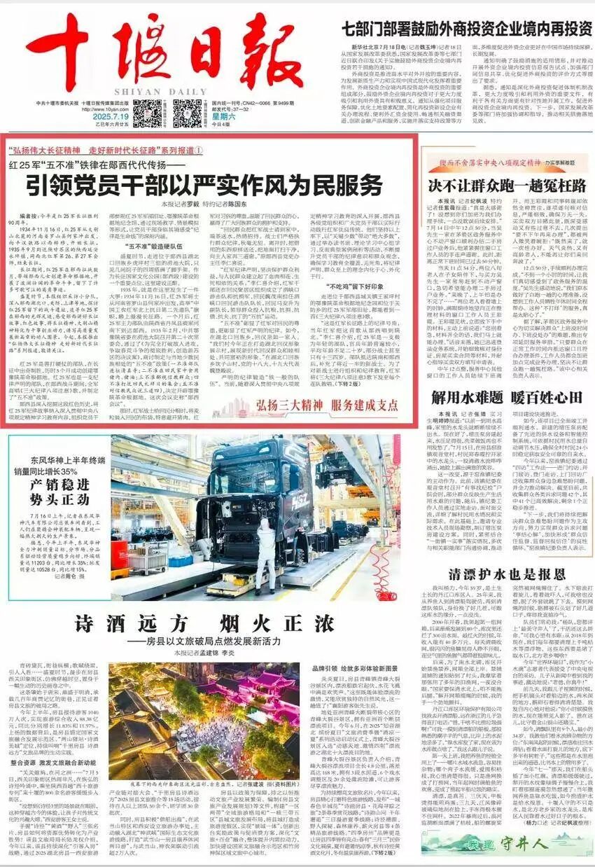 7月19日,十堰日报头版头条以《红25军“五不准”铁律在郧西代代传承——引领党员干部严作风葆本色》为题,挖掘红25军转战郧西期间用朴素的行动诠释了“人民军队”的本质。展现郧西县以深入贯彻中央八项规定精神学习教育为契机,传承红军严明纪律的红色基因,强化纪律教育、践行群众路线、推进作风建设,为郧西县高质量发展提供坚强的纪律保障。