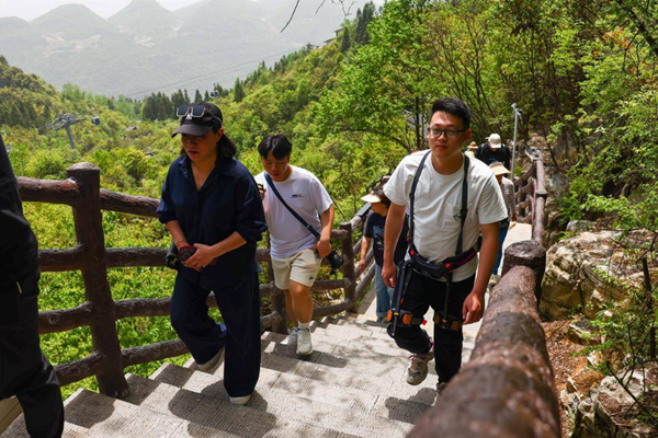 游客在恩施大峡谷景区穿戴外骨骼机器人登山。(湖北日报全媒记者 蔡俊 摄)