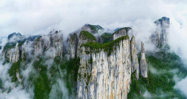 乘坐景区直升机俯瞰,恩施大峡谷石柱林全貌尽收眼底。在七星寨景点,3平方公里范围内有62座石灰岩石峰石柱,高度从20米到285米不等,它们拔地而起,密集分布,似丛林,全球罕见。