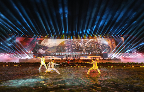 水上舞台,波光粼粼。前区,白衣武者执矛起舞,刚柔并济;中区,铠甲舞者持盾列阵,气势如虹。空中,无人机群与舞台默契呼应,变换出古老神秘的“八阵图”,再现诸葛亮运筹帷幄、决胜千里的智谋传奇……