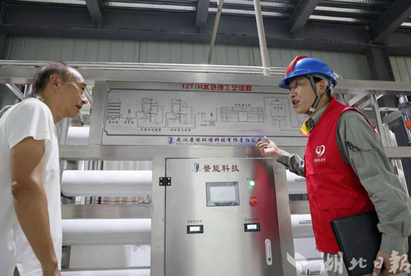 国网湖北电力工作人员走访潜江市广华安康纯净水厂,为保障企业生产用电、推广绿电绿证业务提供现场服务。(吕沛、范玉杰 摄)
