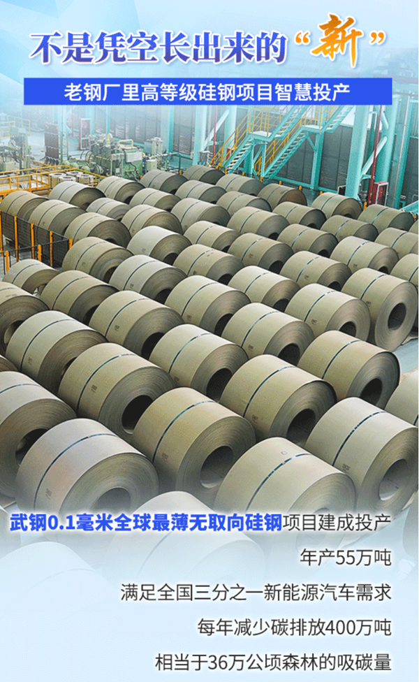 这是从传统优势中长出的“新”:武钢有限早已布局5G+铁钢界面智慧管控平台,如今年产55万吨高等级硅钢的产能,能满足全国三分之一新能源汽车的需求;每年减少碳排放400万吨,相当于36万公顷森林的吸碳量。
