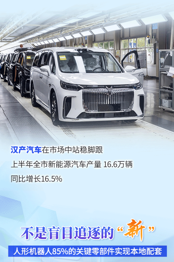 不只是钢卷更轻盈,在武汉第一大支柱产业汽车及零部件产业,燃油车遇冷,新能源车接棒。传统行业加速向“新”,稳住基本盘。今年上半年,全市新能源汽车产量达16.6万辆、同比增长16.5%。
