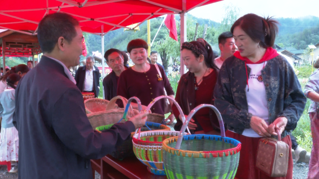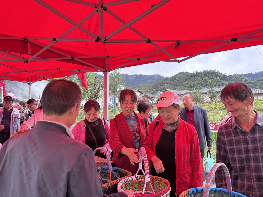 在农副产品展销区,土鸡蛋、土蜂蜜、苞谷柿子酒、手工粉条、葛根粉等琳琅满目的特色产品让人目不暇接,精雕细琢的编织手工艺品更显农人匠心。参展的农民脸上洋溢着幸福的笑容,热情地向过往人群推介自家产品;热闹的叫卖声中,不少游客驻足挑选、争相采购,尽显乡村集市消费烟火气。