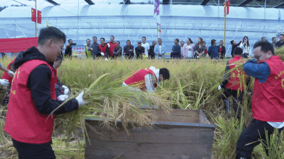 在割稻谷比赛中,三支队伍同时冲入金色的稻浪之中,选手们分工明确、配合默契,镰刀挥舞间尽显农耕智慧。