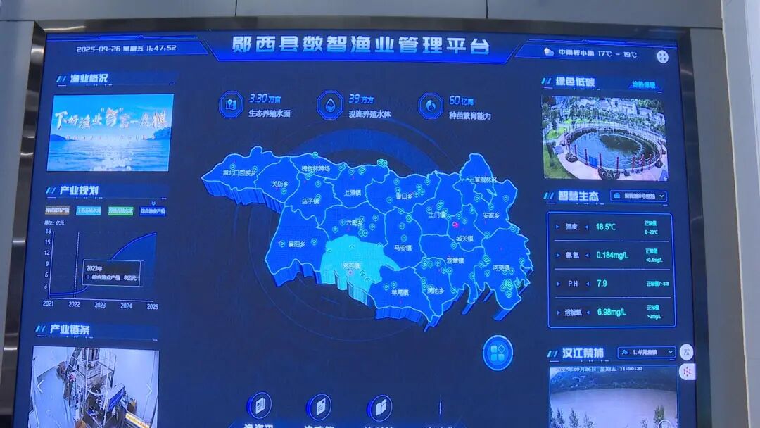 除了“棚上发电”的创新实践,该县还在“棚下养鱼”环节实现智慧化升级。全县已建成覆盖168个鱼池的渔业(渔政)数字化管理系统,布设前端感应装置384个,借助物联网和5G技术,开发并推广运用渔业数字化APP。如今,养殖主体只需在手机上轻轻操作,就能完成远程投喂、补水、控温、增氧等一系列养殖管理工作,充分提高养殖管理效率。