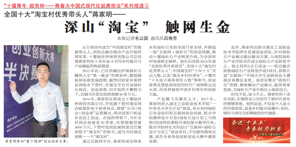 11月24日,十堰日报二版刊发《全国十大“淘宝村优秀带头人”蒋家明——深山“淘宝” 触网生金》,报道郧西蒋家明深耕十余年以电商为桥带富乡邻,以校企融合赋能产业用奋斗书写乡村振兴答卷,彰显新时代青年的责任与担当。