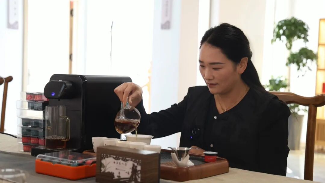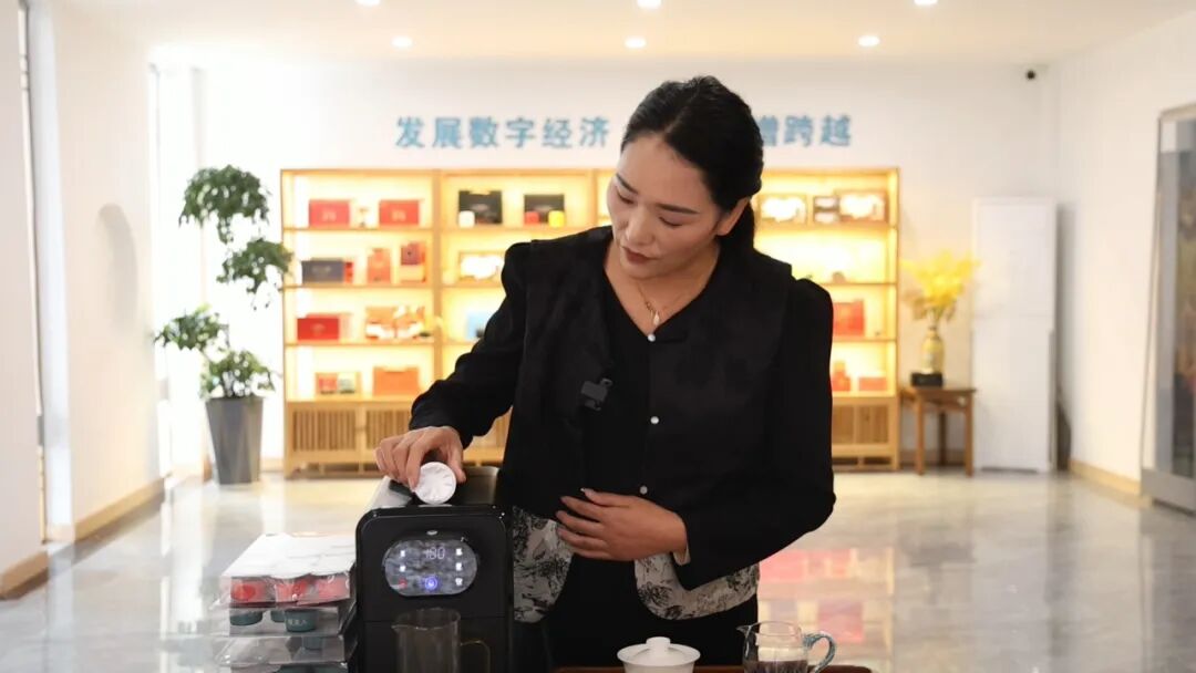 彭茜向记者展示着公司的创新产品:“这款七夕茶叶AI智能泡茶机,它就相当于我们的一个高级茶艺师,里面集中了2000多种算法,可以精准算出每一种茶的泡法。这款七夕美人茶睡美人,通过AI智能识别,从这里放进去,一分钟之内就能泡出最佳口感的茶汤。”